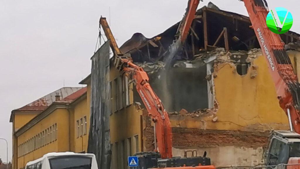 Popri búracích prácach prebieha recyklovanie materiálu a aj drvenie sute. Zbúranie budovy odhadujú asi na týždeň prác. V uplynulých dňoch pracovali podobne na búraní budovy vo vnútri areálu, ktorá spájala dve ďalšie, ktoré zostávajú stáť. Jej súčasťou bol aj veľký komín. Ako prvé budovy boli zbúrané garáže a technické miestnosti na konci areálu.